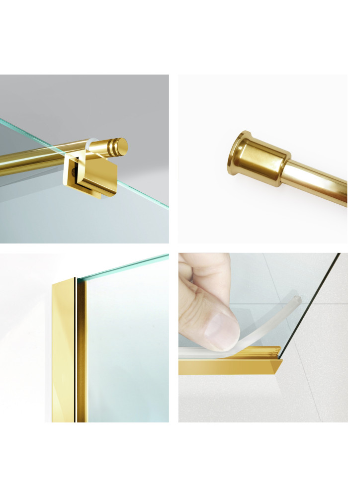 Paravanul de dus Walk-In este prevazut cu profil inox culoare aurie (lat de 2 cm sau 3,5 cm optional) cu garnitura siliconica de etanseizare care asigura a viata lunga si in acelasi timp este o solutie perfecta pentru blocarea apei. Bara stabilizatoare cu design modern forma patrata este inclus in pret.