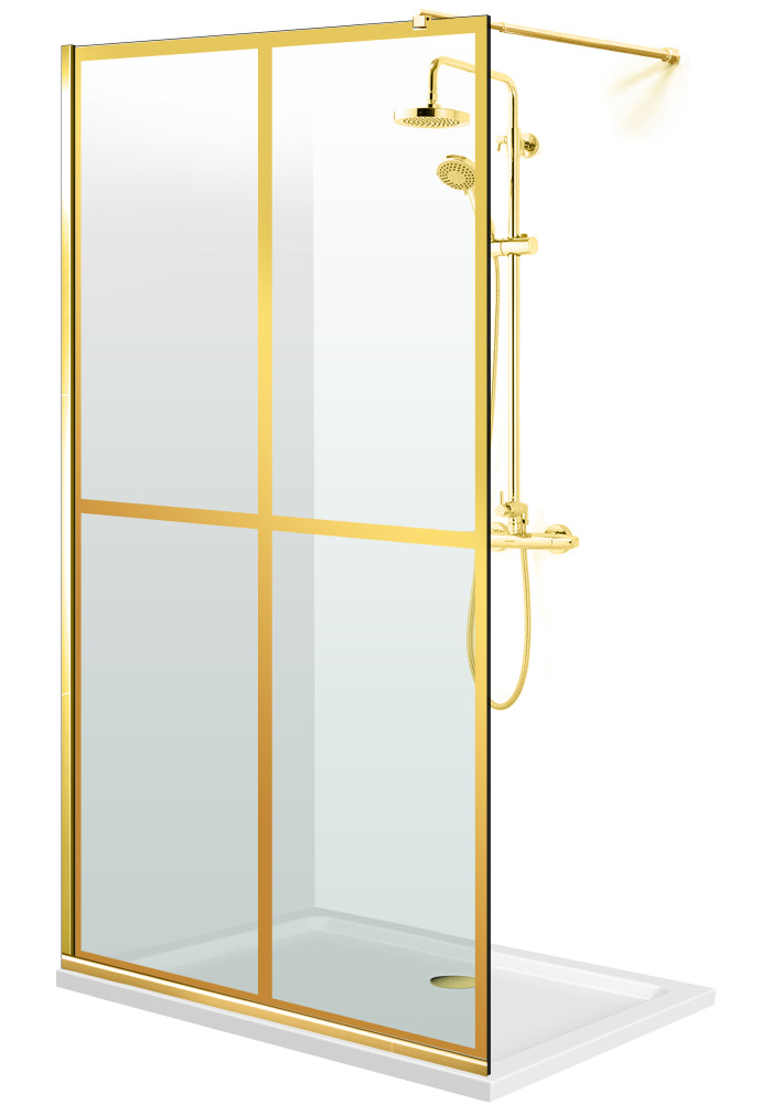 Paravan de dus WALK-IN cu intrare laterala, decorata. Livrare in 7 zile lucratoare! Model decorare prezentat: AQUA ROY GOLD BASIC, din sticla clara SECURIZATA, cu tratament anticalcar 70/80/90/100/110/120 x 195 cm, de 8 mm grosime – executie pretentioasa cu materiale de calitate top si de durata precum si un design minimalist si modern. Culoarea decorului este obtinuta cu cea mai avansata tehnologie nano – fabricat exclusiv in Germania.