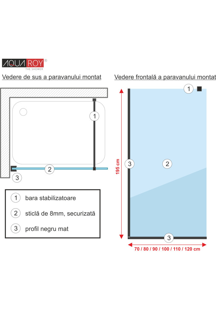 Bara stabilizatoare (cu kit de montaj inclus), acorda o rezistenta pentru tot paravanul de dus walk-in pentru o folosinta in conditii de siguranta. Paravanul de dus se aseaza direct pe pardoseala sau pe cadita. In situatia in care asezati pe pardoseala este necesar sa aveti un drenaj (scurgere) potrivita.