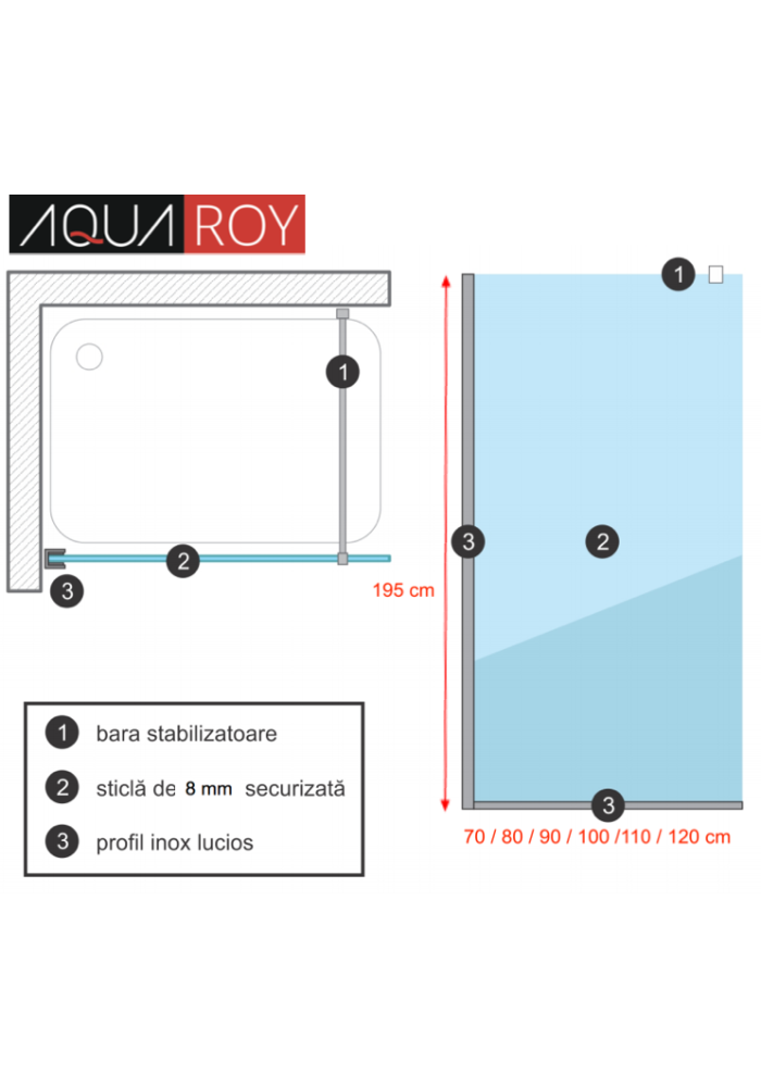 b)Aveti posibilitatea sa alegeti din 6 variante de dimensiuni de paravane dus: 70 / 80 / 90 / 100 / 110 / 120 cm x 195 cm.