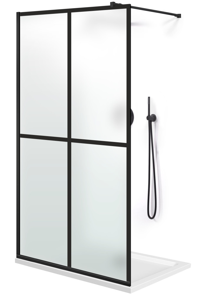 Paravan de dus WALK-IN cu intrare laterala, decorata. Produs personalizat (model, culoare model la alegere) se executa la comanda – livrare in max.5 zile lucratoare!  Model decorare prezentat: AQUA ROY BLACK BASICdin sticla MATA SECURIZATA de 8 mm grosime, cu tratament anticalcar- executie pretentioasa cu materiale de calitate top si de durata precum  si un design minimalist si modern. Culoarea decorului este obtinuta cu cea mai avansata tehnologie nano – fabricat exclusiv in Germania.