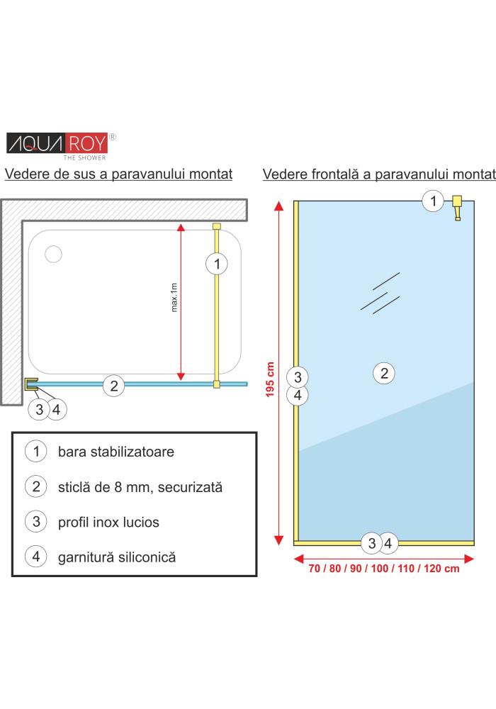 Sticla clara de calitate produsa in UE, securizata, 8 mm grosime, in 6 dimensiuni standard, canturi slefuite perfect lucioase. Aveti posibilitatea sa alegeti din 6 variante de dimensiuni de paravane dus: 70 / 80 / 90 / 100 / 110 /120 mm x 195 cm.