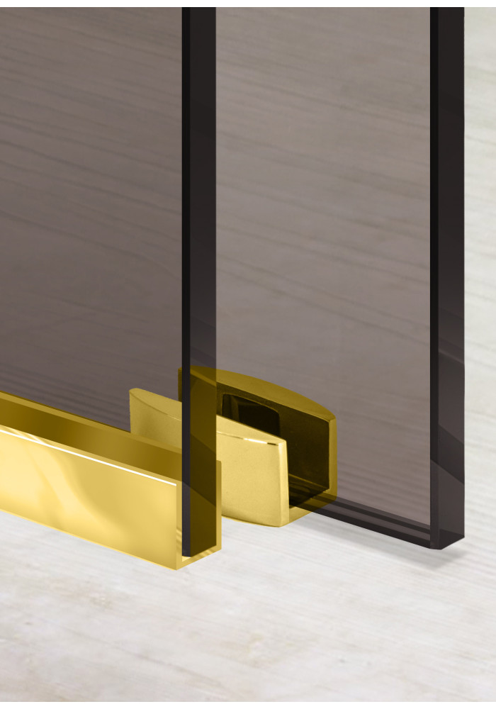 Usa sticla dus culisanta cu perete fix Glissando Gold culoare aurie, model Urban auriu, sticla bronz, securizata, cu canturi slefuite si perfect lucioase, cabina de dus cu usa glisanta la dimensiuni standard se fabrica pentru urmatoarele latimi de nisa:122-140 / 140-150 / 150-160 / 160-170 / 170-180 cm x 205 cm. Executie pretentioasa cu materiale de calitate top si de durata. Peretele de dus cu usa glisanta are toata feroneria din INOX SS304 culoare aurie luciu oglinda cu un aspect si o calitate deosebita!
