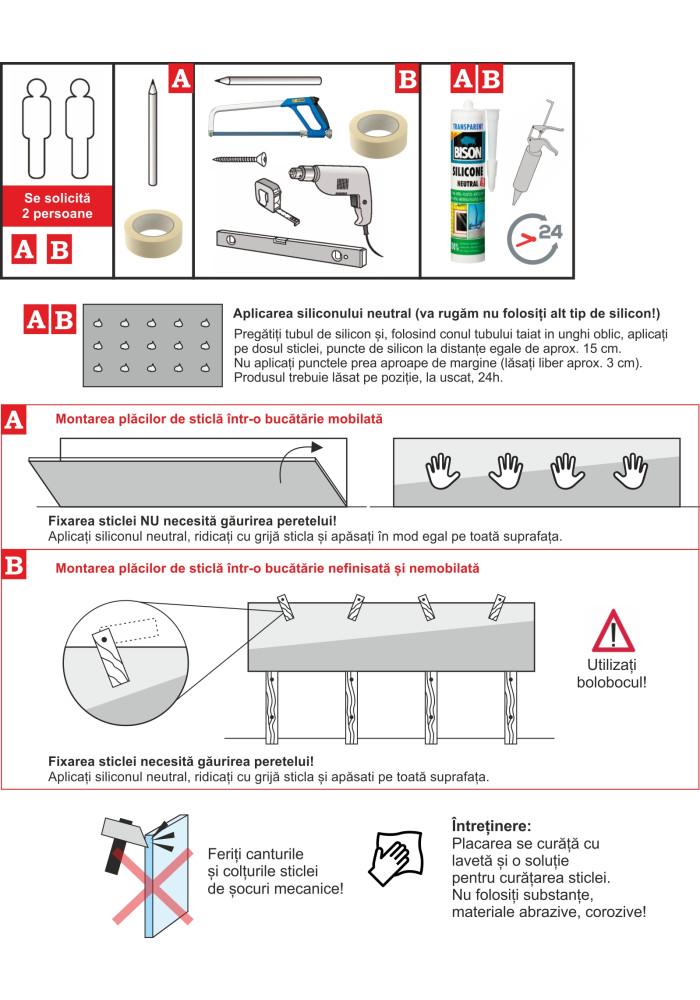 Aplicarea sticlei vopsite pentru placari (perete, mobila etc) este foarte simpla,se realizeaza prin folosirea adezivului din silicon transparent NEUTRAL si o banda dubla adeziva pana siliconul se intareste.