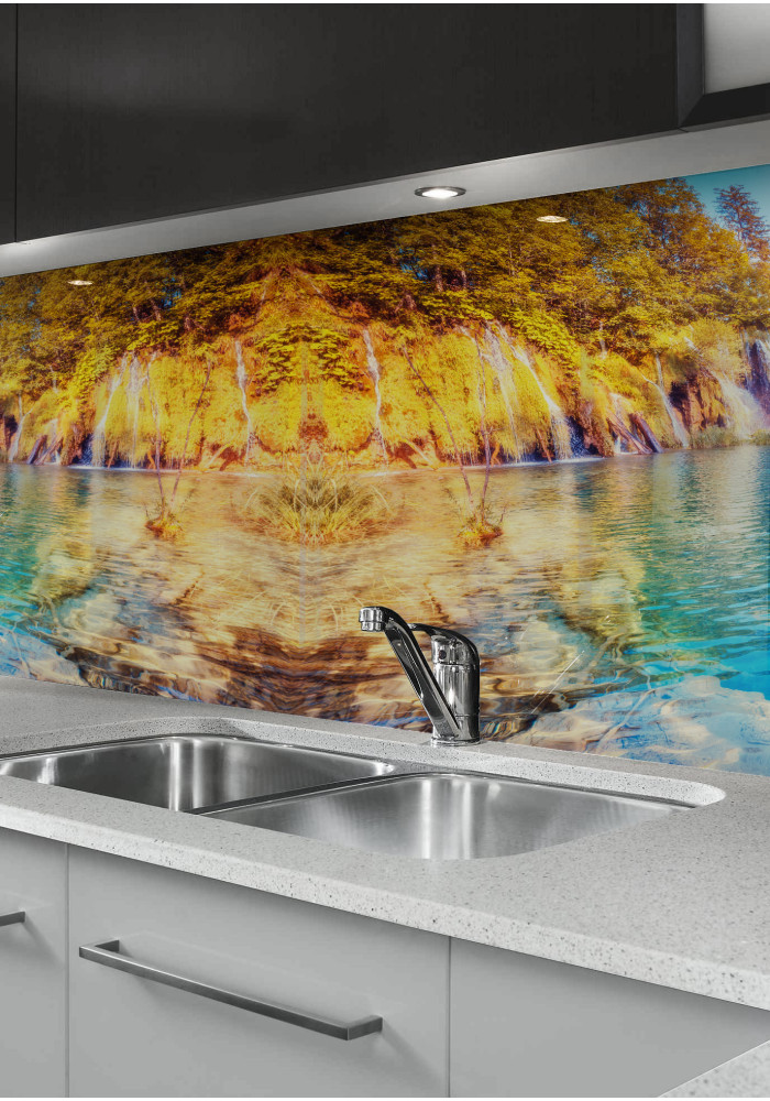 Sticla printata, 6 mm, securizata, canturi slefuite perfect luciose pentru placari. Pentru ca stratul imprimat pe dosul sticlei este foare sensibila, aplicam peste suprafata printata un rand de rasini sintetice pentru a proteja suprafata de deteriorari. In asa fel aveti o sticla printata deosebit de rezistenta!