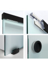 Usa interioara sticla culisanta pentru interioare culiseaza in totalitate pe partea de sus in sina de glisare, acoperita cu un capac decorativ din aluminiu culoare negru mat. Ca urmare pe pardoseala nu veti avea nimic in afara unui buton de ghidaj de 5 cm, care se monteaza la coltul usii. Simplu de montat! In pachet aveti si instructiuni de montaj.