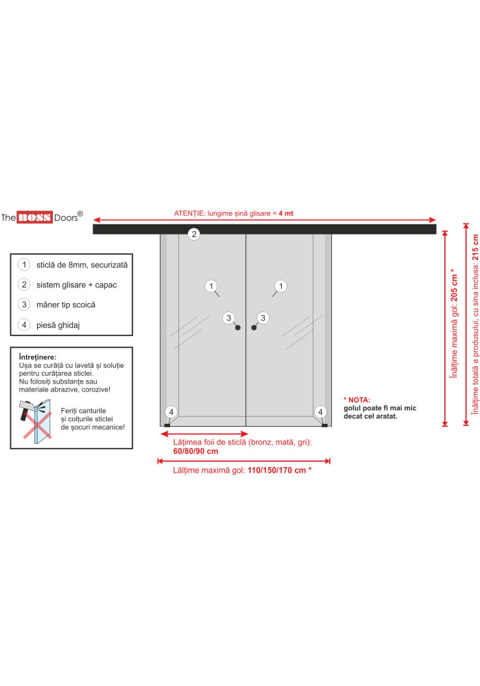 Usa glisanta / Usa culisanta din sticla securizata pentru interioare, denumire model BOSS DUO BLACK.  Usa sticla pentru interioare  culiseaza in totalitate pe partea de sus in sina de glisare, acoperita cu un capac decorativ din aluminiu eloxat. Ca urmare pe pardoseala nu veti avea nimic in afara unui buton de ghidaj de 5 cm, care se monteaza la coltul usii. Simplu de montat! In pachet aveti si instructiuni de montaj.