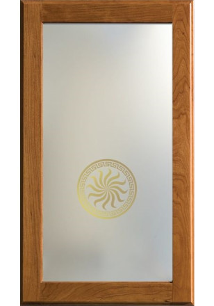 Vitrina sablata, model cu medalion sablat pe sticla mata, model MEDALION SOLARIS. Model de vitrina care se preteaza cu majoritatea silurilor de mobila. Pretul afisat se refera la o vitrina sablata pe sticla satinata, avand dimensiunea de 300 mm x 600 mm si cu o suprafata de pana la 0,2 mp cu canturi neslefuite, sablat cu model de culoare aurie.