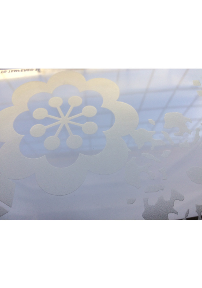 Vitrina sablata, pe sticla mata pentru mobila, model MINIMAL. Sablare in formea abstracta, florala asezata in mod aleator pe suprafta vitrinei.